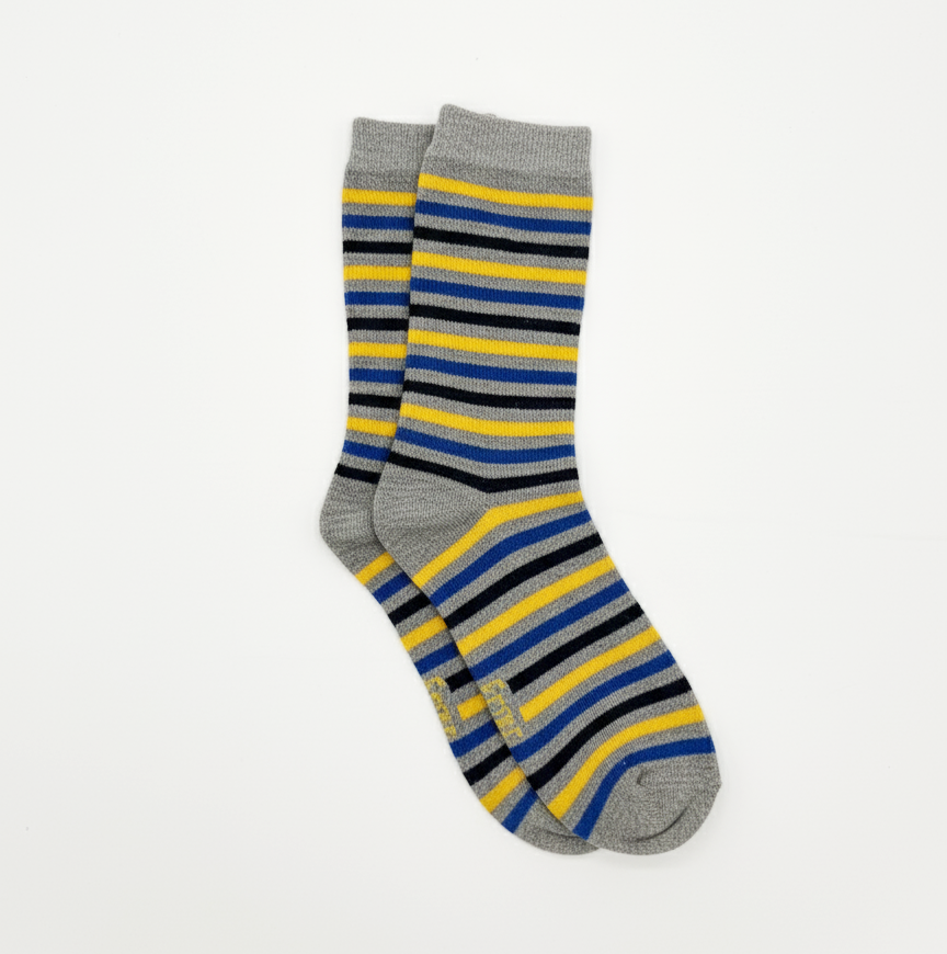 A versatile essential for every wardrobe. These comfortable crew socks feature a neutral grey base with crisp, bold horizontal stripes in black, vibrant yellow, and bright blue. The perfect way to add a pop of color and a classic pattern to your everyday style.