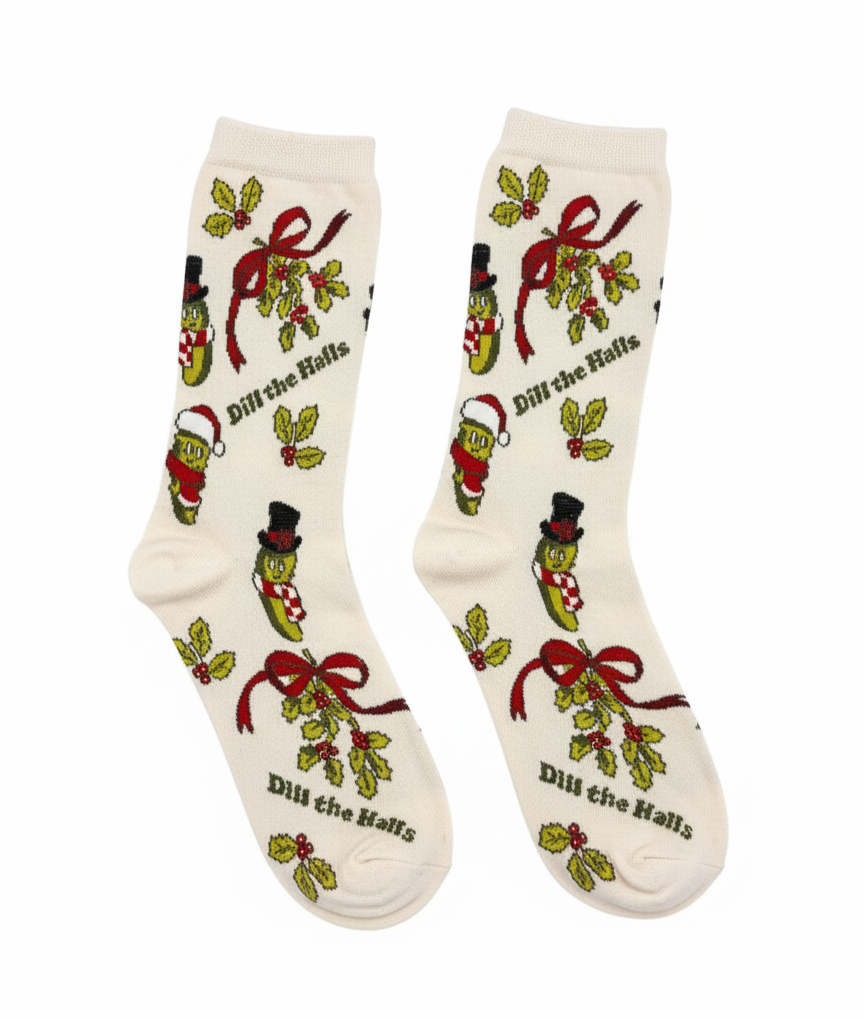 The ultimate humorous holiday socks! Featuring adorable, dressed-up Christmas pickles (some in Santa hats, some in top hats) surrounded by holly and bows. The playful phrase "Dill the Halls" adds an extra touch of festive pun. A light, neutral background makes the colorful holiday details pop.