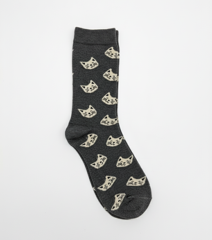 For the cat lover in all of us! These cozy, charcoal grey crew socks feature an all-over pattern of adorable, stylized off-white cat faces. Perfect for keeping warm and showing off your favorite furry friends. Their neutral color makes them easy to pair with any casual look.