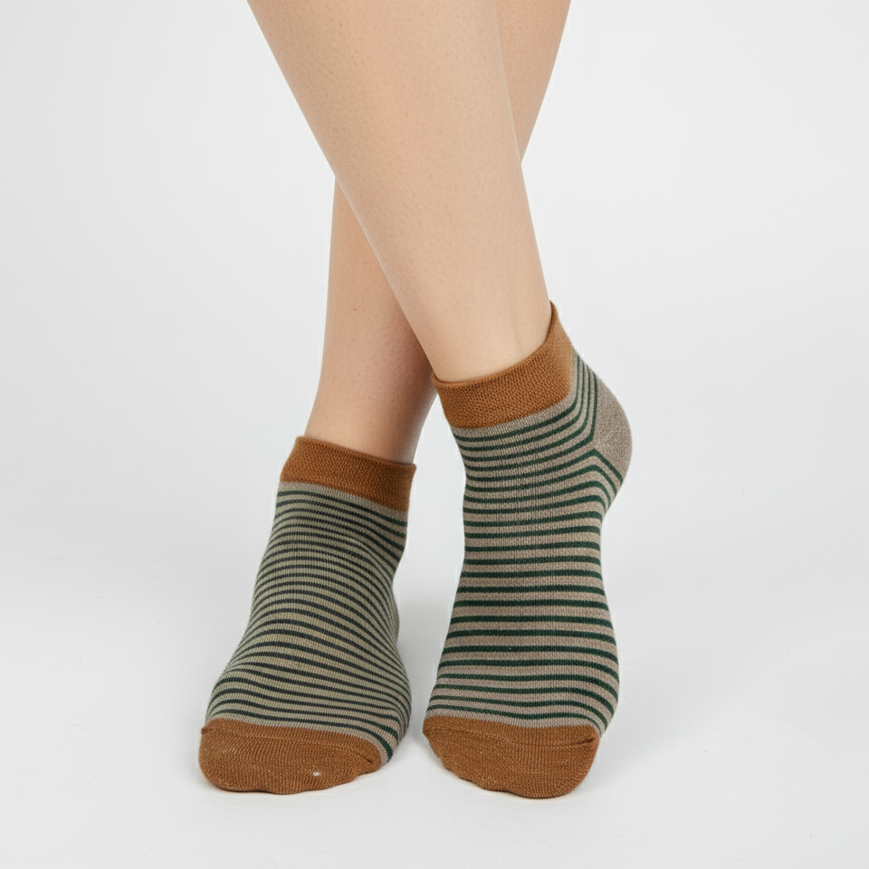 Earthy tones meet cozy comfort. These ankle socks feature thin, alternating khaki and forest green horizontal stripes, finished with a rich brown cuff and toe. The snug, soft knit provides warmth and texture, making them a great choice for transitioning seasons or adding a rustic, natural feel to your casual footwear.