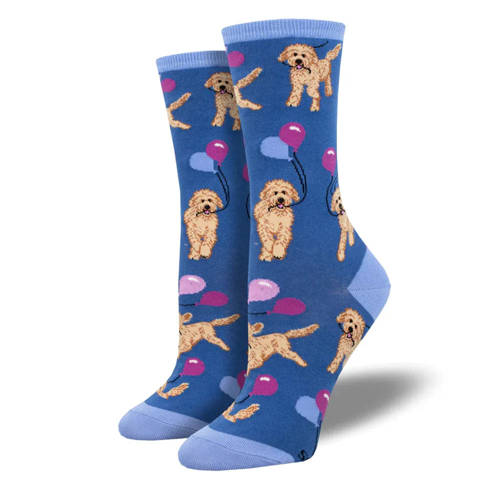 Labra-doodle-doo! Goldendoodles and Labradoodles are dog breeds made from mixing retrievers with poodles to make great service dogs and companion animals. These socks are covered in oodles of cute doodle dogs running with balloons, making them perfect for your next puppy party!