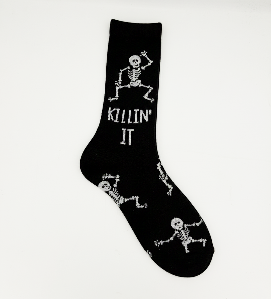 Show everyone you're "Killin' It" with these fun, edgy socks! Featuring dancing white skeletons and the bold white text "KILLIN' IT" on a classic black background. Perfect for Halloween, themed parties, or whenever you feel like crushing your goals in style. *Material: Durable cotton blend. Crew length.*