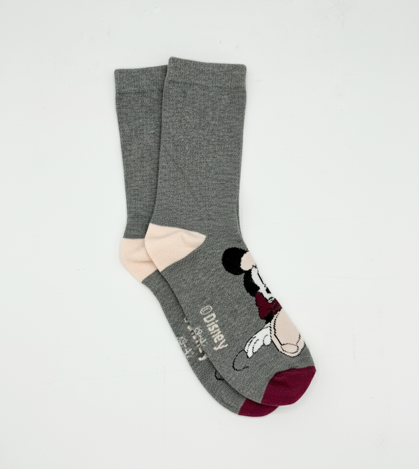 Celebrate the timeless charm of Disney. These official socks feature a cozy grey knit with a large graphic of a smiling Mickey Mouse on the foot, wearing a maroon scarf. A blush pink heel and maroon toe complete this cute and comfortable licensed design.