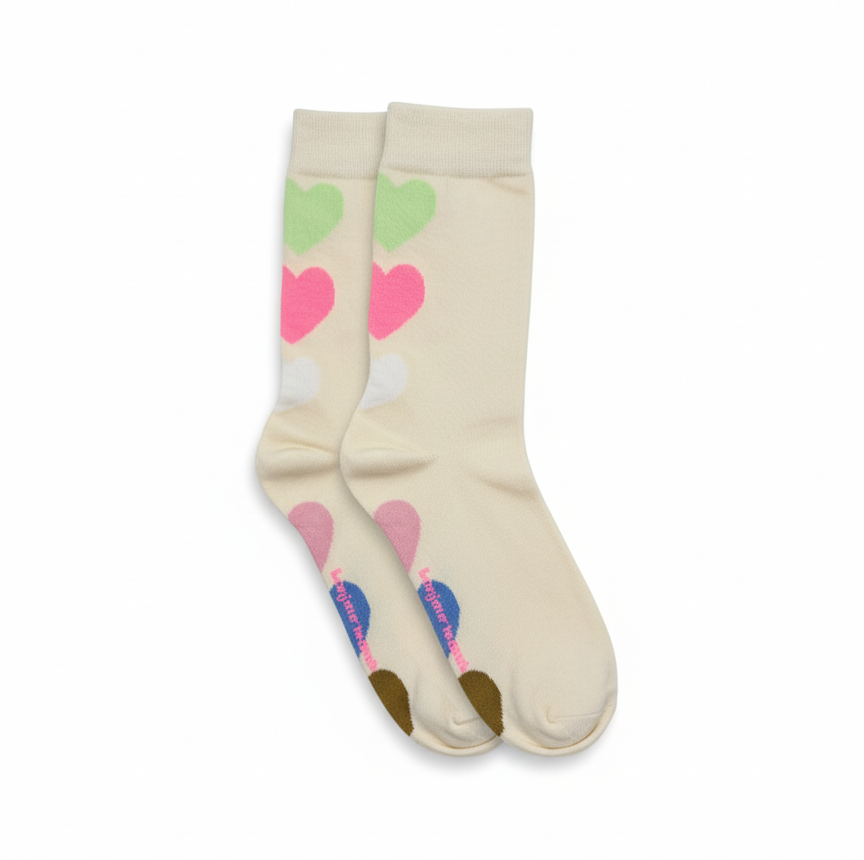 Show the love! These sweet and simple crew socks feature a neutral cream/off-white base adorned with a column of cascading hearts in soft mint green, hot pink, and white. A playful color-blocked toe/heel adds a fun, modern finish.