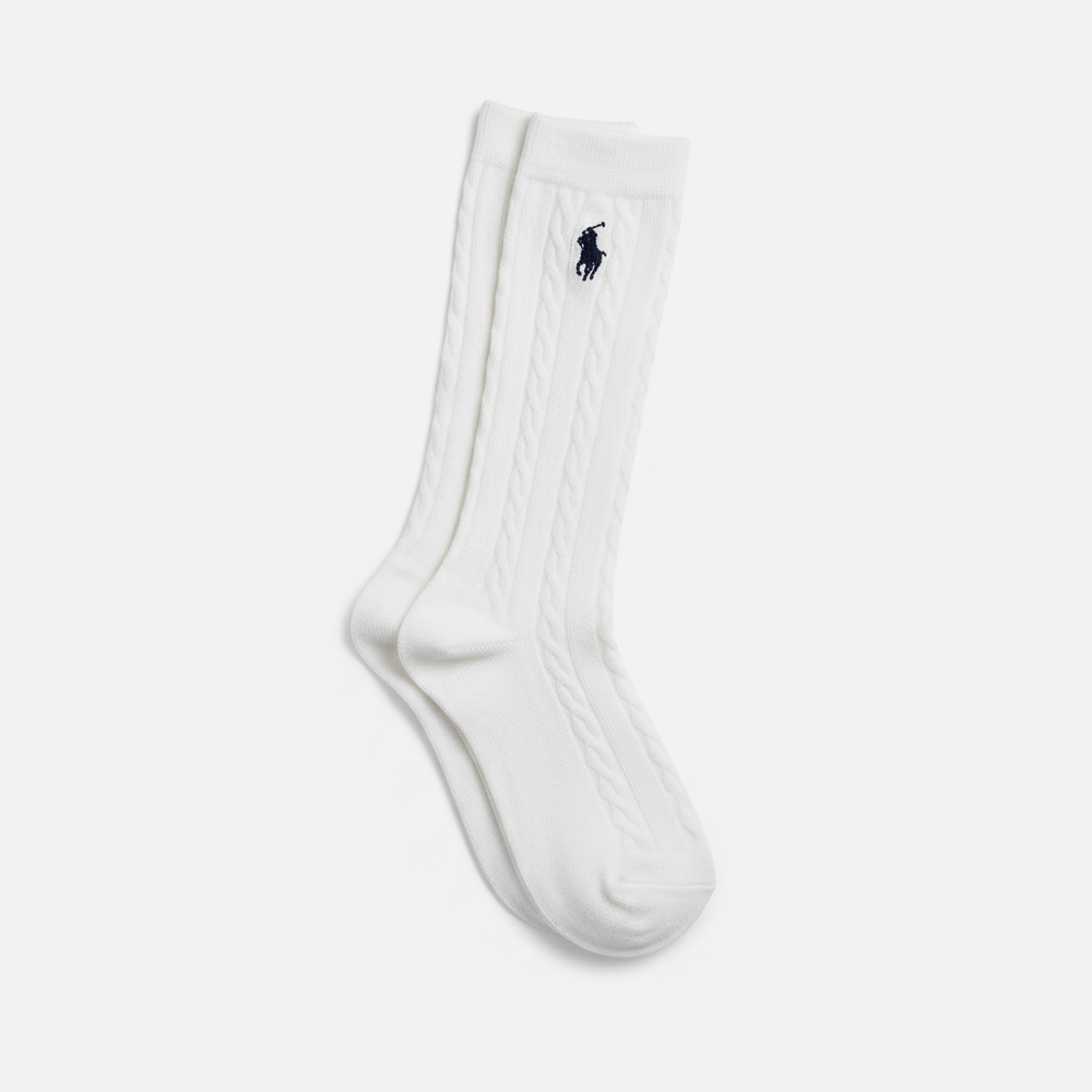 Timeless and elegant, these crisp white crew socks feature a traditional cable-knit pattern that adds texture and sophistication. The iconic navy Polo pony logo is subtly embroidered on the cuff, a mark of quality and classic style. A refined choice for any occasion.