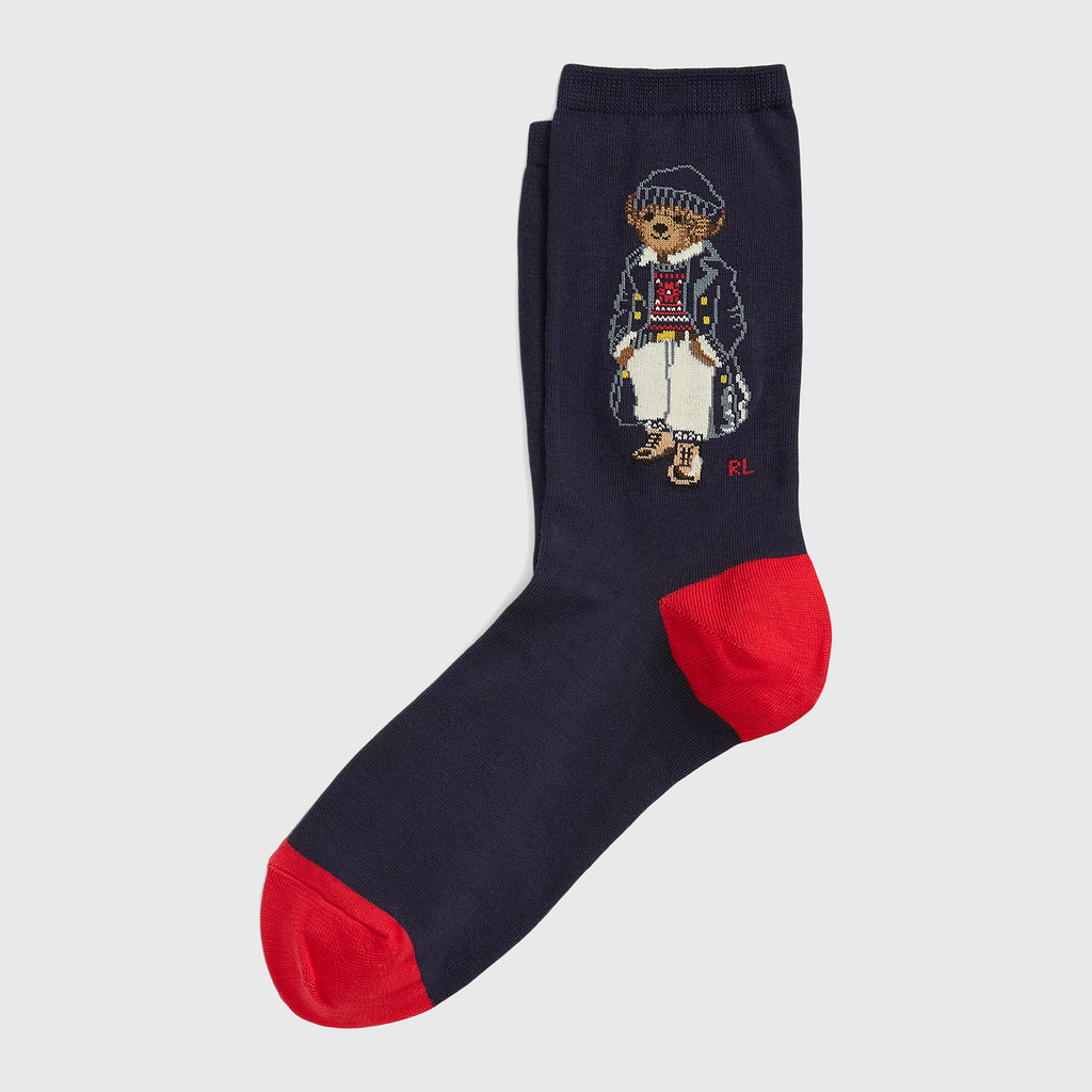 Featuring a classic maritime look, the Polo Bear is dressed in a navy coat and sailor's cap. The deep Navy Blue base is sharply contrasted by the Red heel and toe, giving these socks a polished, nautical-inspired aesthetic perfect for adding character to any outfit.