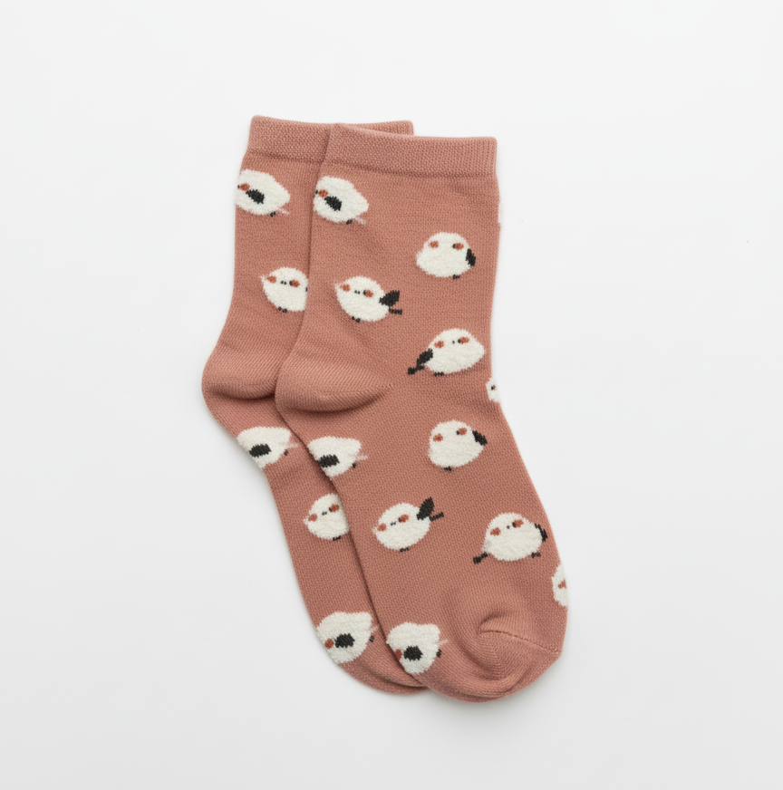These adorable socks feature a charming repeating pattern of long-tailed tit birds (sometimes called 'minions' in Japan) on a dusty mauve/rosy pink background. They're soft, whimsical, and perfect for adding a touch of cute nature to your step. *Material: Soft, comfortable knit. Crew length.*