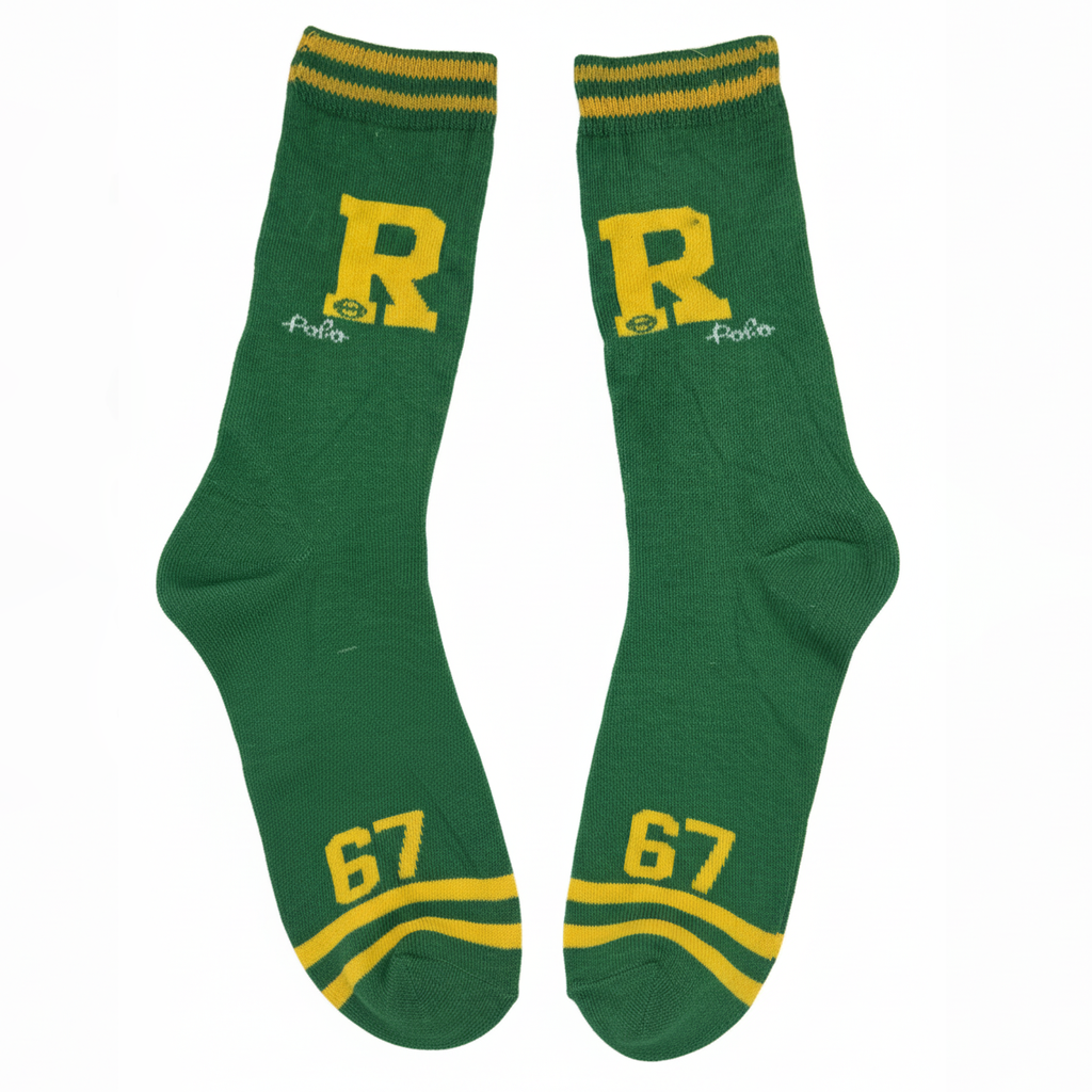 Varsity Vibe Green Crew Socks. Channel classic collegiate style with these sporty green crew socks. Featuring the bold yellow letter 'R,' the number '67,' and striped accents at the cuff and heel. They offer a comfortable fit with a retro, athletic look. Material: Soft Knit. Length: Crew. Occasion: Casual Sportswear, Prep Style.