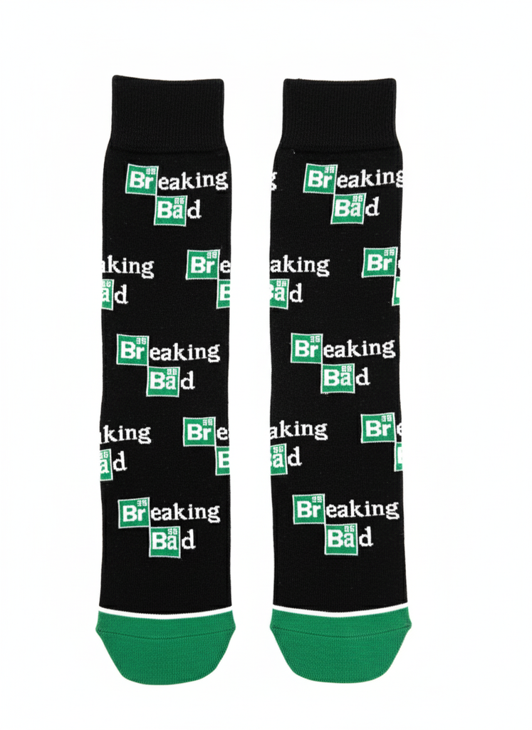 Cook up some style with these officially licensed Breaking Bad crew socks. They feature a black base with an all-over repeating pattern of the classic logo, which incorporates the elements for Bromine (Br) and Barium (Ba) from the periodic table. The vibrant green toe adds a perfect touch of signature color. Features: Crew length, repetitive logo pattern, comfortable cotton blend. Best for: Breaking Bad fans, TV show enthusiasts, subtle geek culture wear.