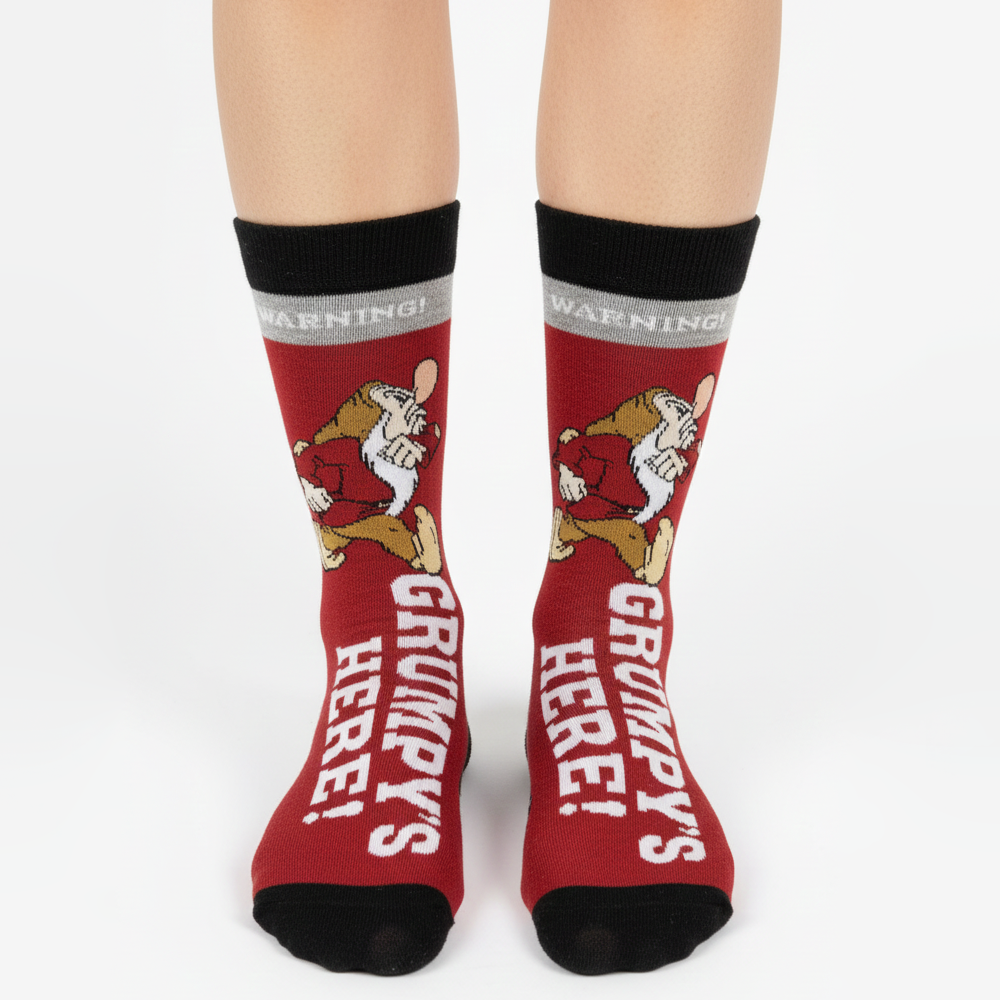 Consider this your official fair warning. These bright red socks featuring Snow White's most iconic dwarf are perfect for those days when you aren't feeling the "Happy" vibe. Includes a grey "Warning" stripe detail.