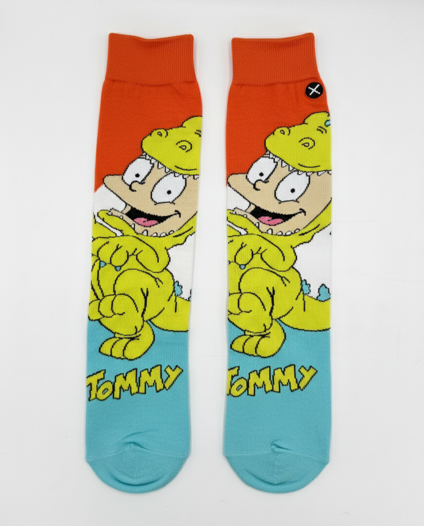 Grab your screwdriver and head out on an adventure with these fantastic Rugrats crew socks! They feature a large, colorful graphic of Tommy Pickles dressed up in his famous green Reptar costume, set against an orange upper and a bright teal lower sock. The name "TOMMY" is knit boldly at the foot. A perfect hit of 90s nostalgia for your feet. Features: Crew length, multi-color block design, large cartoon graphic. Best for: 90s cartoon fans, Nickelodeon nostalgia, unique casual wear.