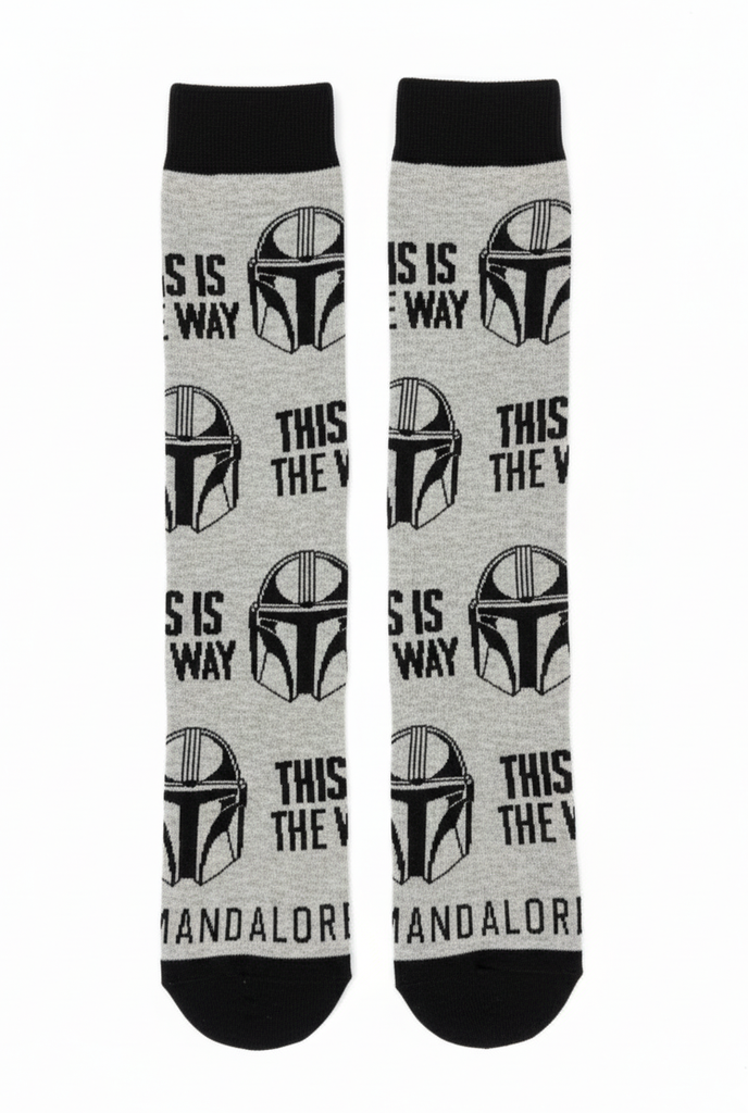 This is the way... to awesome footwear! These officially licensed Star Wars socks feature a repetitive pattern of the iconic Mandalorian helmet and the famed phrase "THIS IS THE WAY" on a heather gray background. The words "MANDALORIAN" are knit clearly above the toe, showing your dedication to the Creed. Features: Crew length, soft gray heather base, black and white knit graphic. Best for: Star Wars and Mandalorian fans, sci-fi collectors, casual wear.