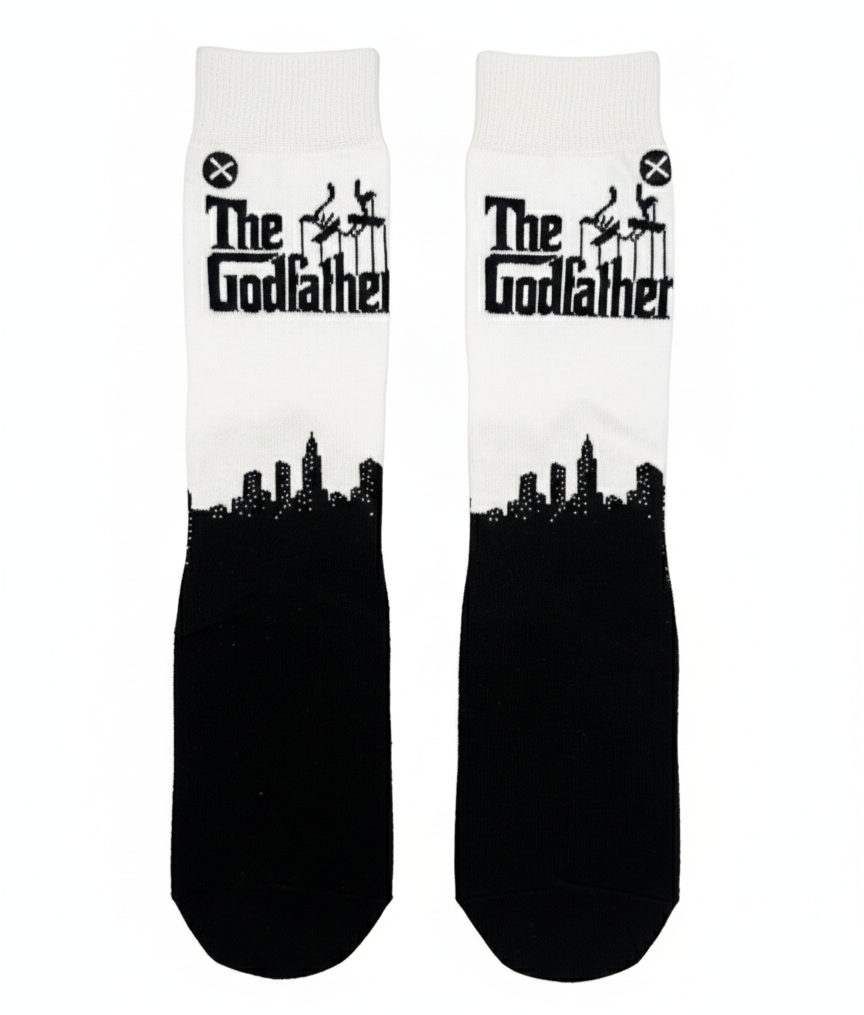 Make an offer they cannot refuse! These sophisticated, officially licensed The Godfather crew socks feature a powerful black and white design. The upper portion displays the classic logo and puppet silhouette, while the lower portion features a dramatic black silhouette of the New York City skyline. Features: Crew length, high contrast black and white design, movie logo and cityscape graphic. Best for: Classic film fans, movie buffs, subtle pop culture style.