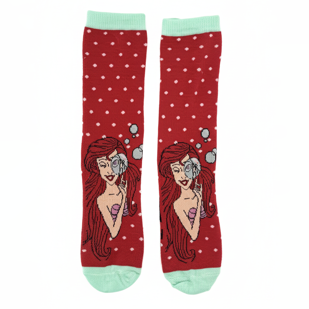 Make a splash with these charming Ariel socks. Set against a deep red background with white polka dots, these socks feature vibrant character art and a fresh mint green trim on the cuff, heel, and toe.