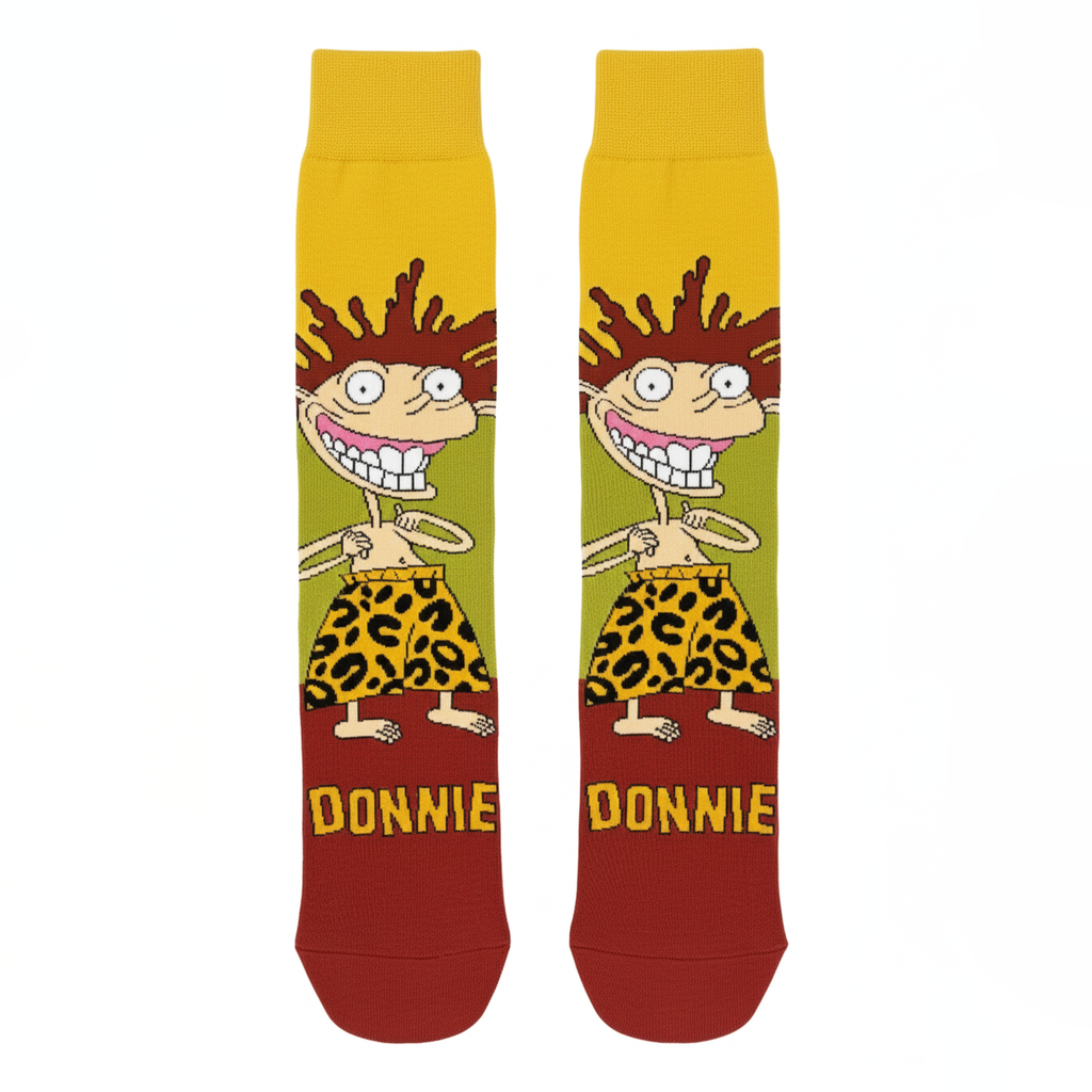 Channel your wild side with Donnie from The Wild Thornberrys. Featuring his signature leopard-print shorts and frantic expression on a rich burgundy and sunset-yellow gradient, these socks are a loud and proud tribute to 90s Nicktoons.