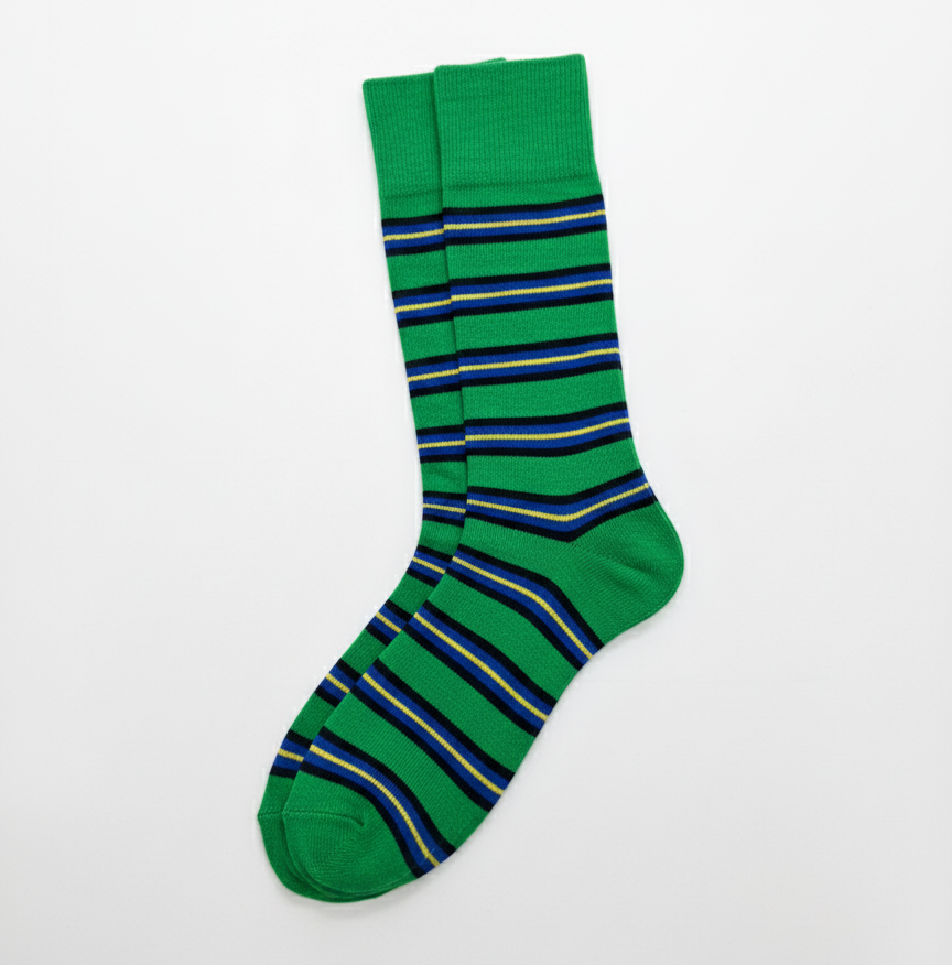Unleash a burst of color with these vibrant striped socks. The bright green base is crisscrossed with thin stripes of black, navy blue, and neon yellow, creating an active, eye-catching design. Perfect for adding personality to business attire or casual looks. *Material: Fine, breathable knit. Mid-calf length.*