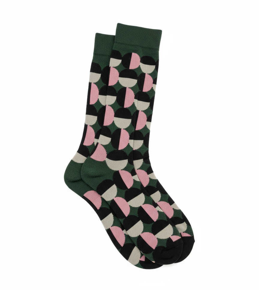 A vibrant throwback to retro design, these socks feature an eye-catching pattern of interlocking half-circles in shades of forest green, powder pink, black, and off-white. They're a playful, stylish statement piece that brings an art-deco feel to your everyday wardrobe. *Material: Comfortable, durable knit. Mid-calf length.*