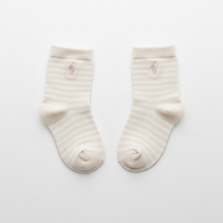 Soft, neutral baby crew socks with a subtle stripe pattern in cream and tan, highlighted by a dainty pink embroidered Polo Pony logo on the cuff.