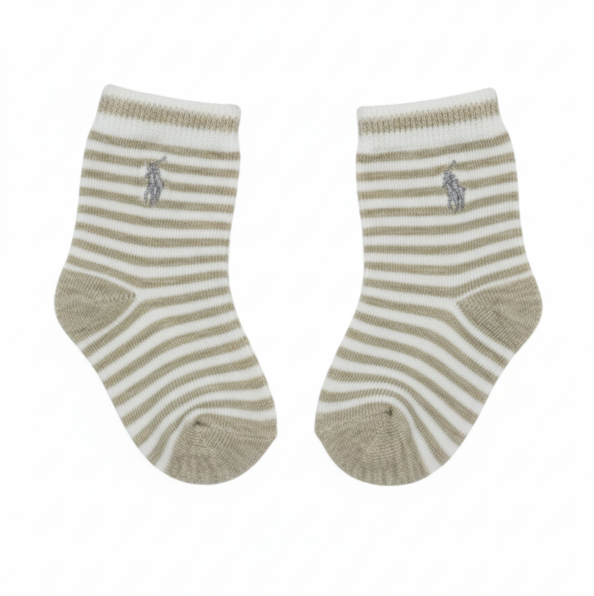 Comfortable ankle socks for babies in a white and tan stripe pattern, accented with the dark embroidered Polo Pony logo. A stylish and classic everyday essential.