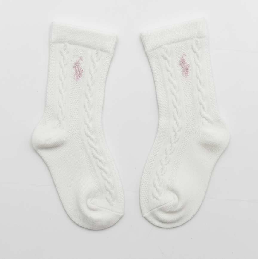 RL POLO BABY WHITE CABLE KNIT PINK PONY SOCKS (0-2YRS)