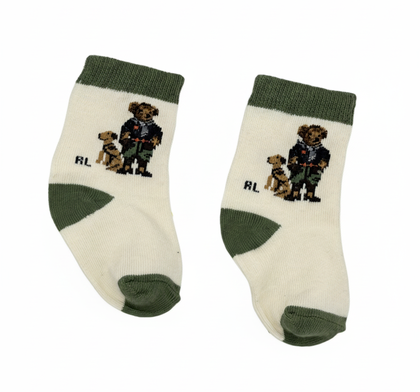 Cream-colored socks showcasing a charming embroidered design of the iconic Polo Bear standing with two small dogs. Features a contrasting green heel and toe for a playful touch.