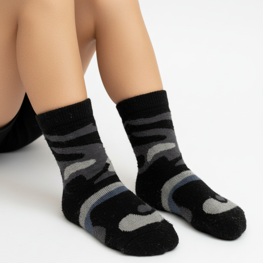 For the mini-adventurer! These Little Recruit Camo Crew socks feature a cool, subtle grey and black camouflage pattern. They have a slightly thicker, rugged knit for durability and warmth, perfect for outdoor play, hiking, or just looking tough on the playground.