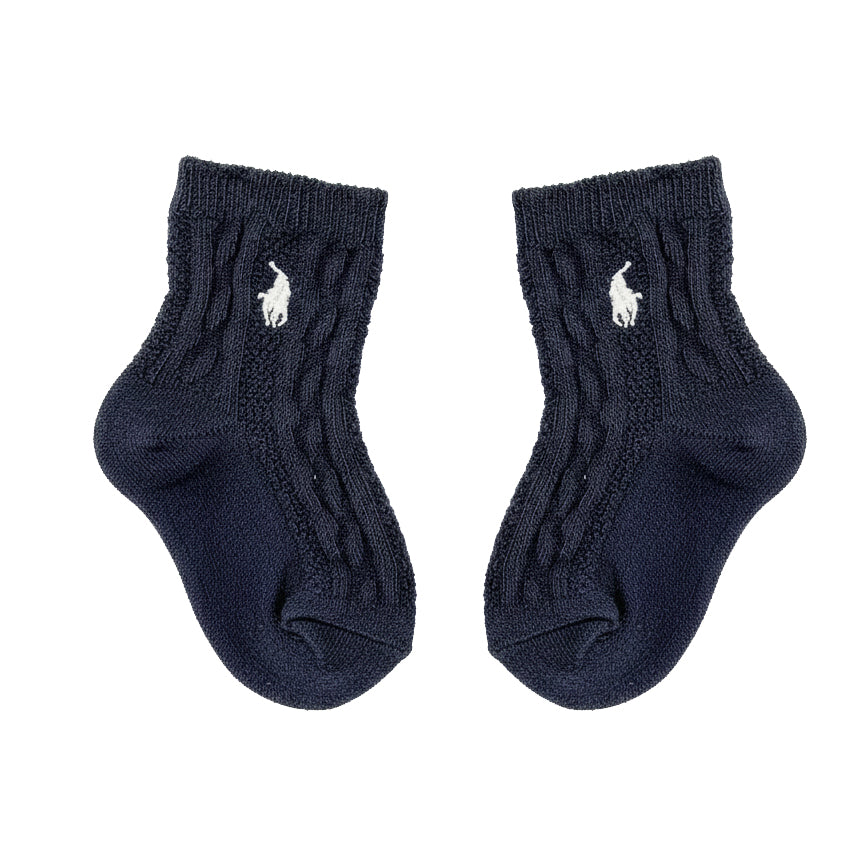 RL POLO NAVY CABLE KNIT WHITE PONY SOCKS (0-2YRS)