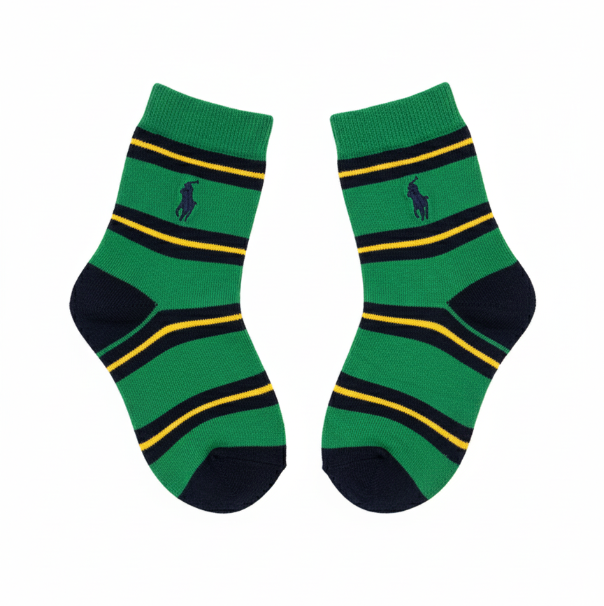 Add a pop of sporty color with these Varsity Stripe Crew socks! The bold green base with navy and yellow stripes makes them a standout accessory. Crafted for active kids, they feature a soft, durable knit and a comfortable fit that stays up without being too tight.
