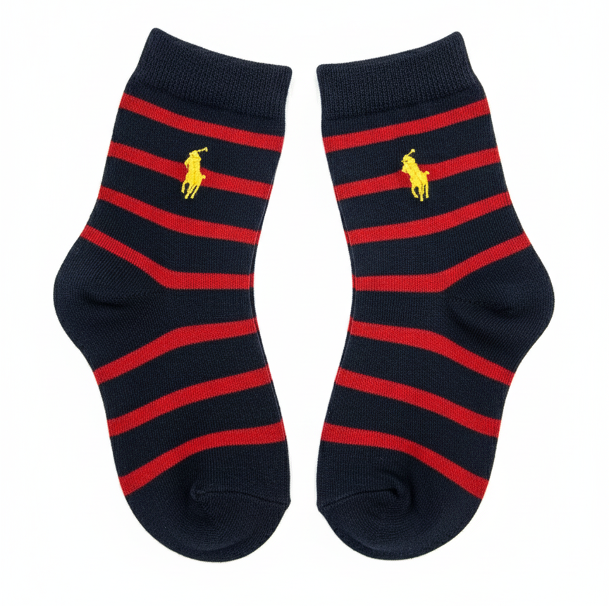 A sporty and bold classic. These crew socks feature thick horizontal stripes of deep navy and bright red, accented by a contrasting yellow embroidered logo. The durable knit ensures they are comfortable for all-day wear and hold their shape wash after wash.