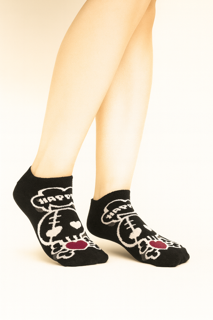 Get spooky and sweet with these black ankle socks featuring a white skeleton or sugar skull graphic and 'HAPPY' text on the front. With a bold red heart replacing the nose, these are a fun, slightly eerie accessory for Halloween or any day you want a gothic-cute look.