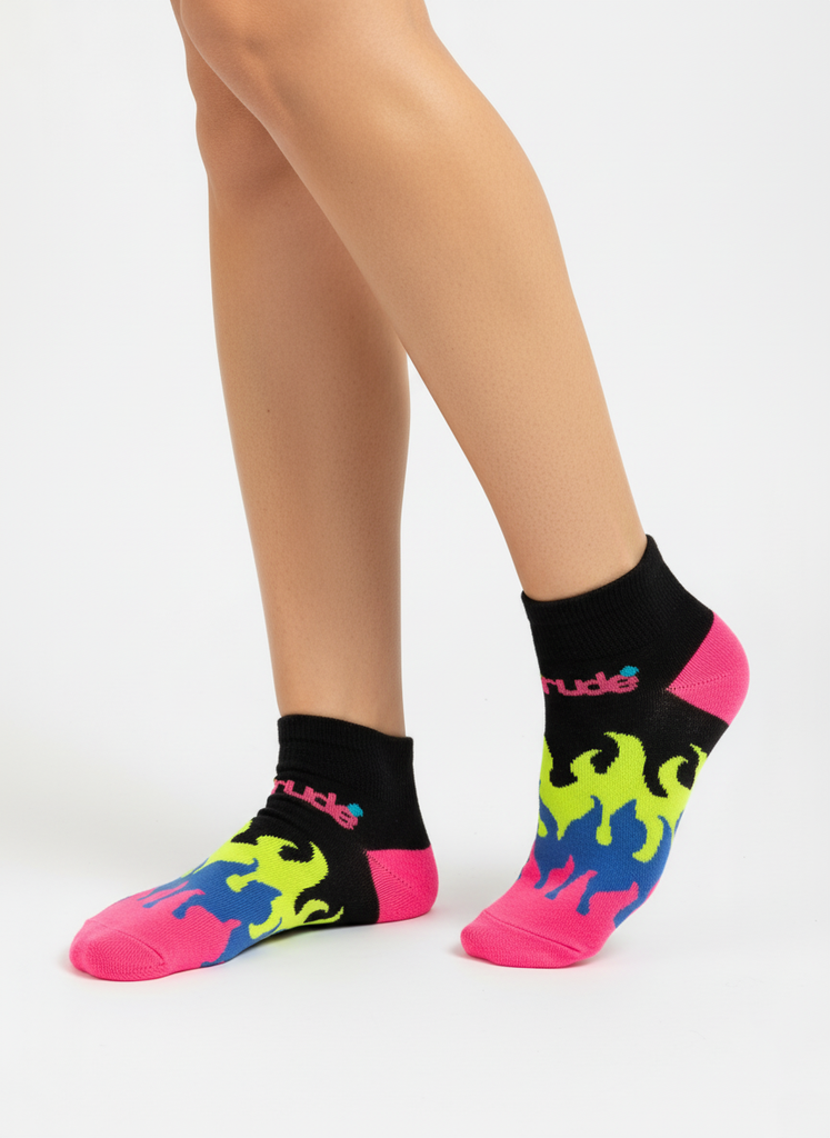 Bold, low-cut ankle socks featuring a black cuff and heel, with a vibrant design of neon pink, lime green, and royal blue flames wrapping around the foot. They also include a small logo near the ankle.