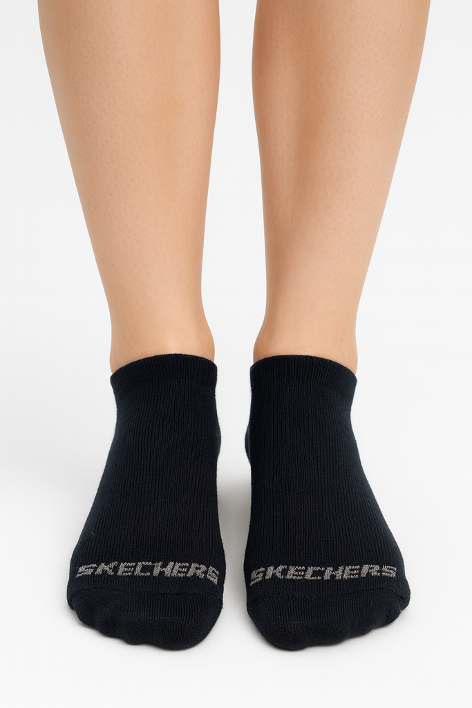 Solid black, low-cut no-show socks with the 'SKECHERS' logo printed in grey text across the toe box. Essential athletic wear designed to stay hidden inside shoes.