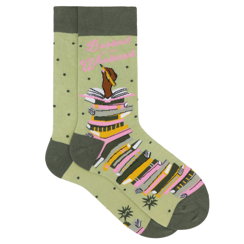 Book Weekend Crew Socks. Declare your plans for some relaxation! These stylish sage green crew socks feature a playful, colorful stack of books with the fun reminder: 'Booked Up Weekend.' Ideal for your lazy reading days, literary gatherings, or anytime you want to signal you're taking a break.