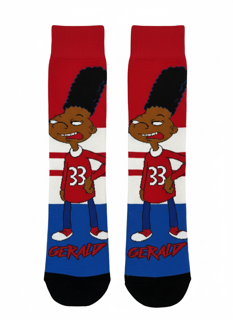 Better listen to the legend! Celebrate Arnold's cool best friend with these Gerald Johanssen Crew Socks. Featuring Gerald in his signature '33' jersey against a bold red, white, and blue stripe, these socks capture the essence of the classic cartoon. They're a fun, comfortable blast of 90s nostalgia for every Hey Arnold! fan.
