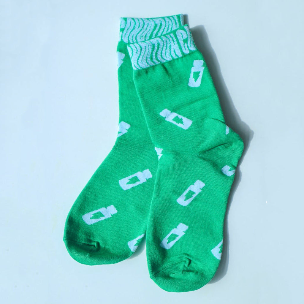These vibrant, lime-green socks are covered in a repeating pattern of a white bottle, giving them a high-energy, playful look. With a distinctive wave pattern at the cuff, they’re perfect for athletes, comic book fans, or anyone who wants a bold splash of color and a boost of fun for their day.