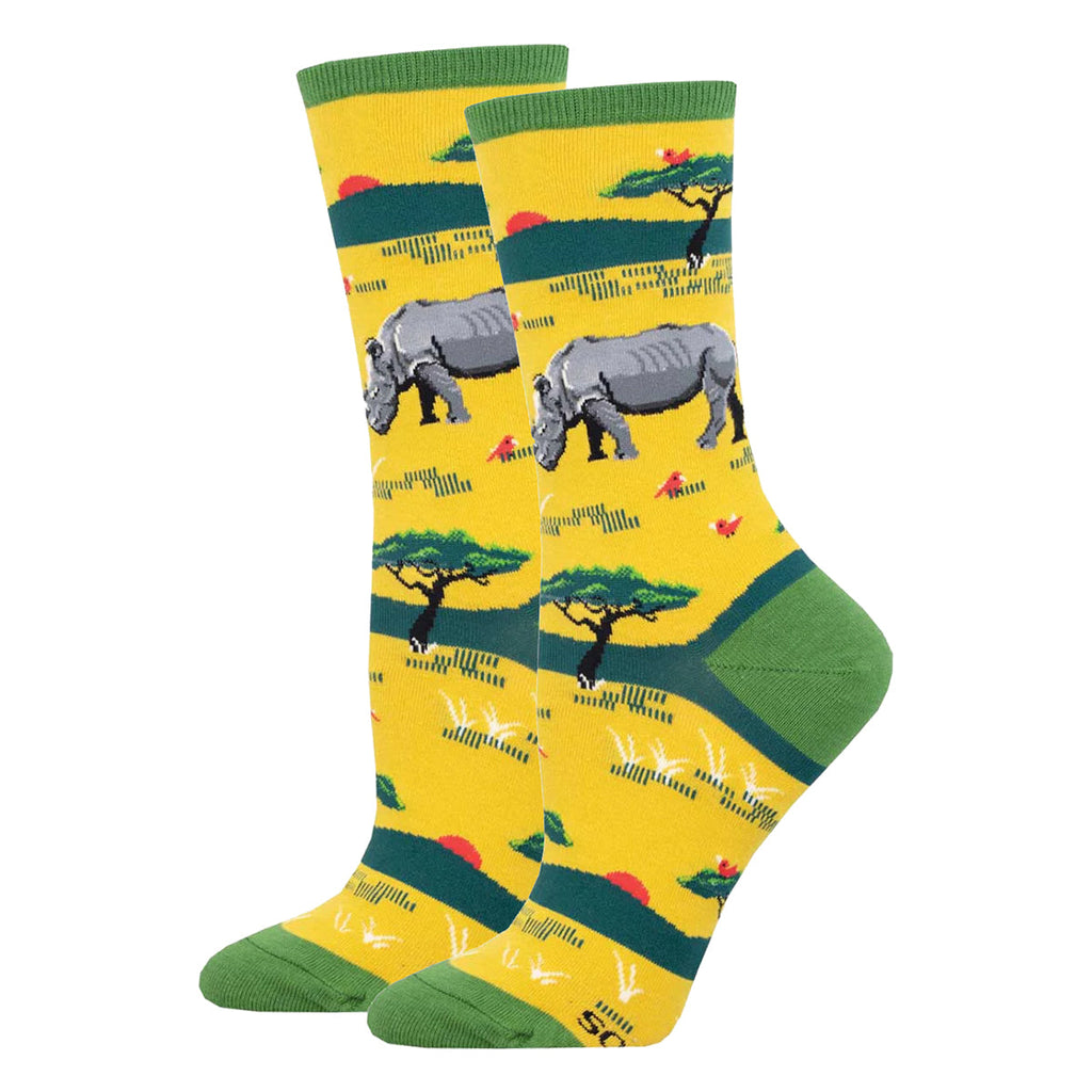 Yellow Rhino Safari Crew Socks. Go on an adventure with these vibrant, **sunny yellow crew socks**! The pattern depicts majestic rhinos roaming the savanna against an acacia tree and sunset backdrop. A bold, eye-catching choice for animal lovers and those passionate about African wildlife.