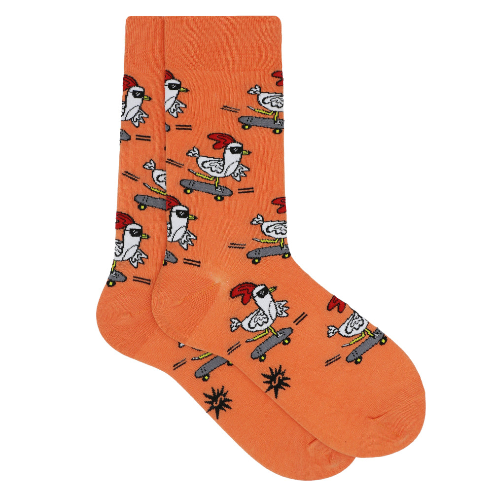 He's got the sunnies and the speed! These zany, bright orange socks feature a repeating pattern of a cool chicken wearing a Santa hat and sunglasses, ripping it up on a skateboard. The perfect quirky addition to your wardrobe, these socks are a clucking good time and a fun way to express your playful side.